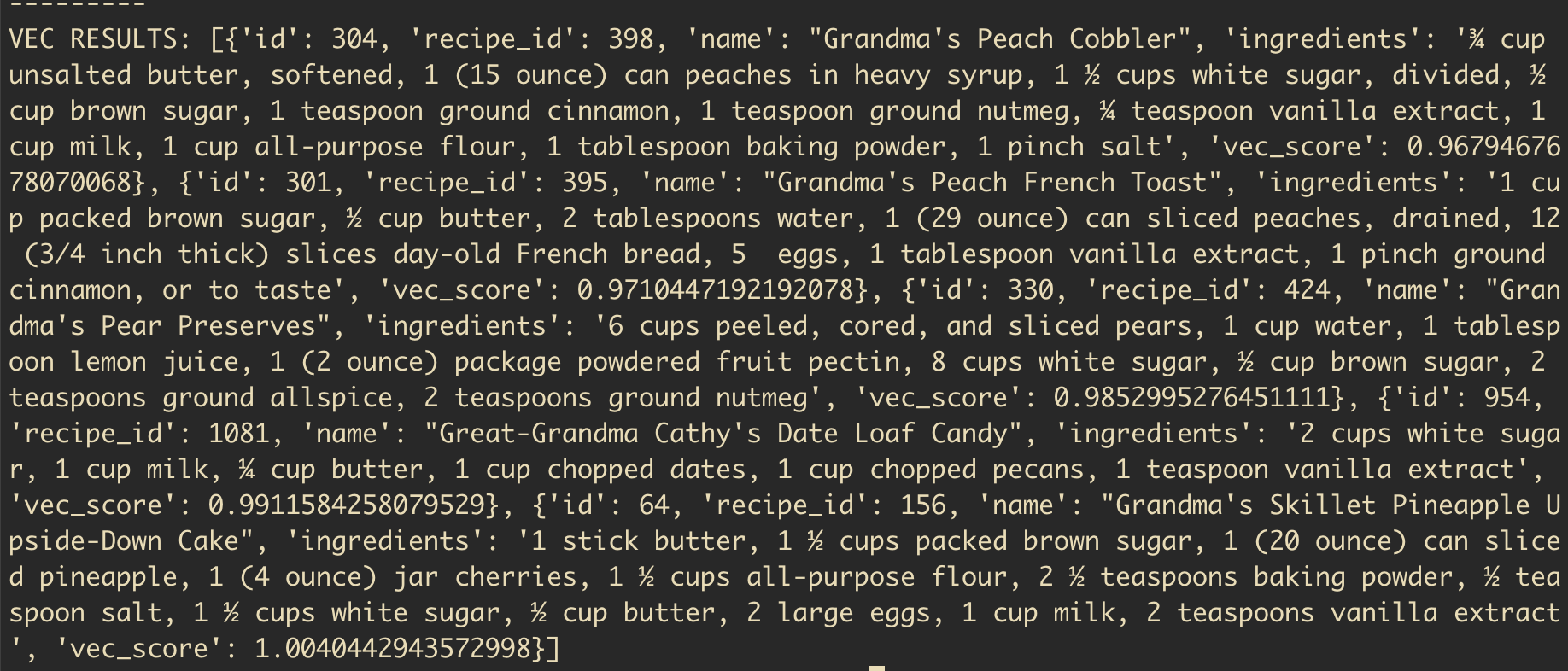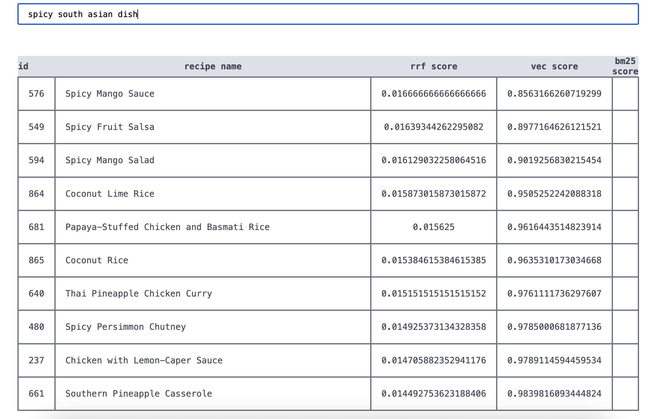 If you run a semantic only query like "grandma's comfort food" you should see docs only with a vec_score and no kw_score