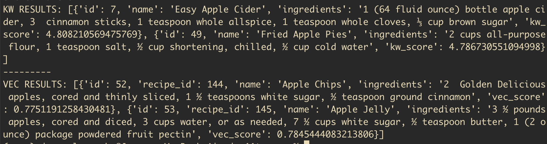 This loops through the RRF ranked docs, grabs the relevant recipe information from our original database queries and adds a kw_score and / or vec_score to the doc, as well as the recipe information.